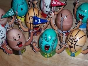 Easter just isn't the same without family. I'm missing everyone and wishing I was there for the egg hunt...big bucks are involved and I always win. Next year. The run down: -Made Banana Pancakes -Colored Eggs -Drew self portrait to be revealed tomorrow -Brats for Dinner -Deadwood -Carnivale finale -Chocolate Ice Cream -Rehearse for Millie audition -Sleep Over all it was a pretty good day. Still miss my fam. Here's a picture of our colored eggs. We did a sports theme this year courtesy of Mom. Love to all.
